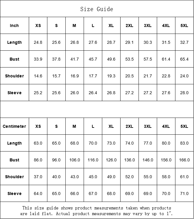 | Inch | XS | S | M | L | XL | 2XL | 3XL | 4XL | 5XL |