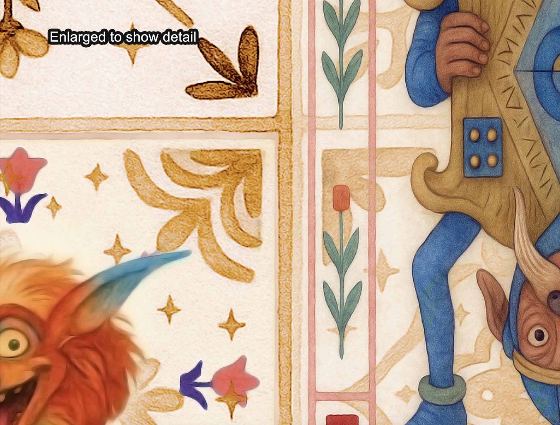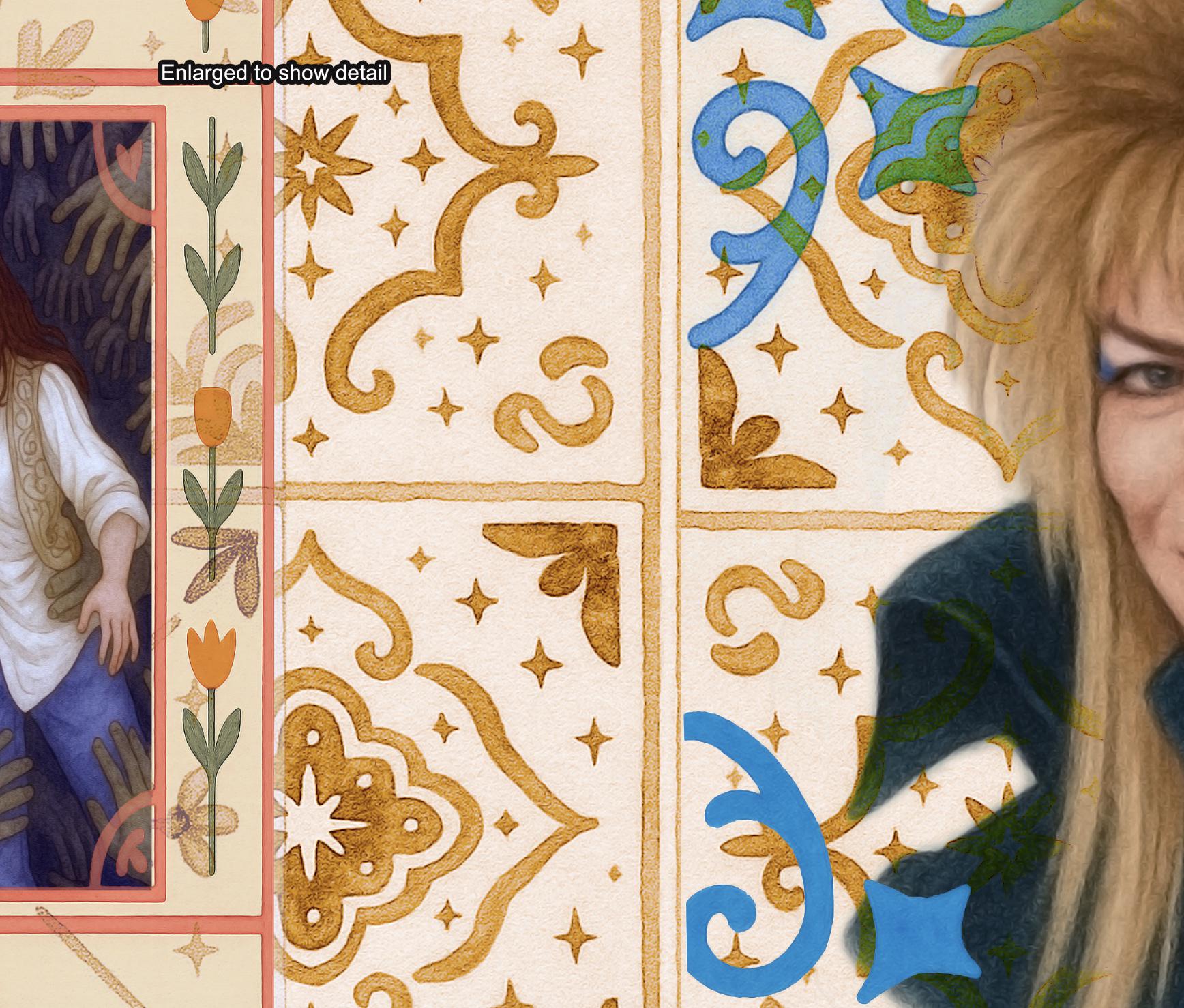 This perfectly imperfect design captures the cozy charm of a cottagecore crazy quilt while celebrating the beloved fantasy films and romantasy stories of the 1980s. Each square is decorated with custom watercolor illustrations of favorite characters, magical creatures, and unforgettable Labyrinth-inspired moments.
