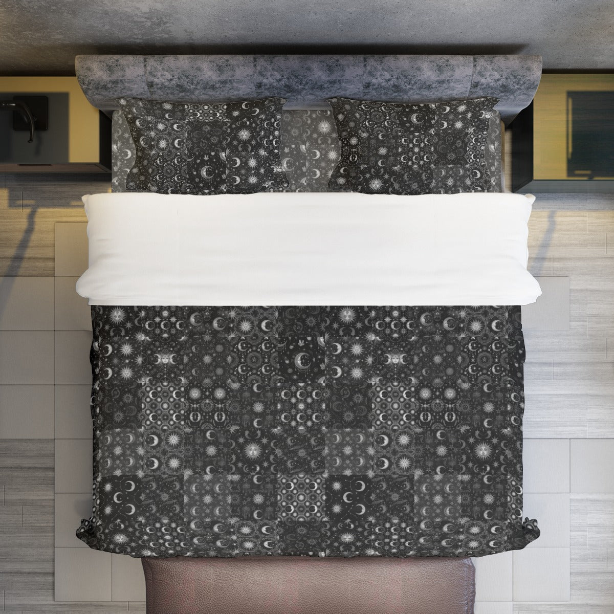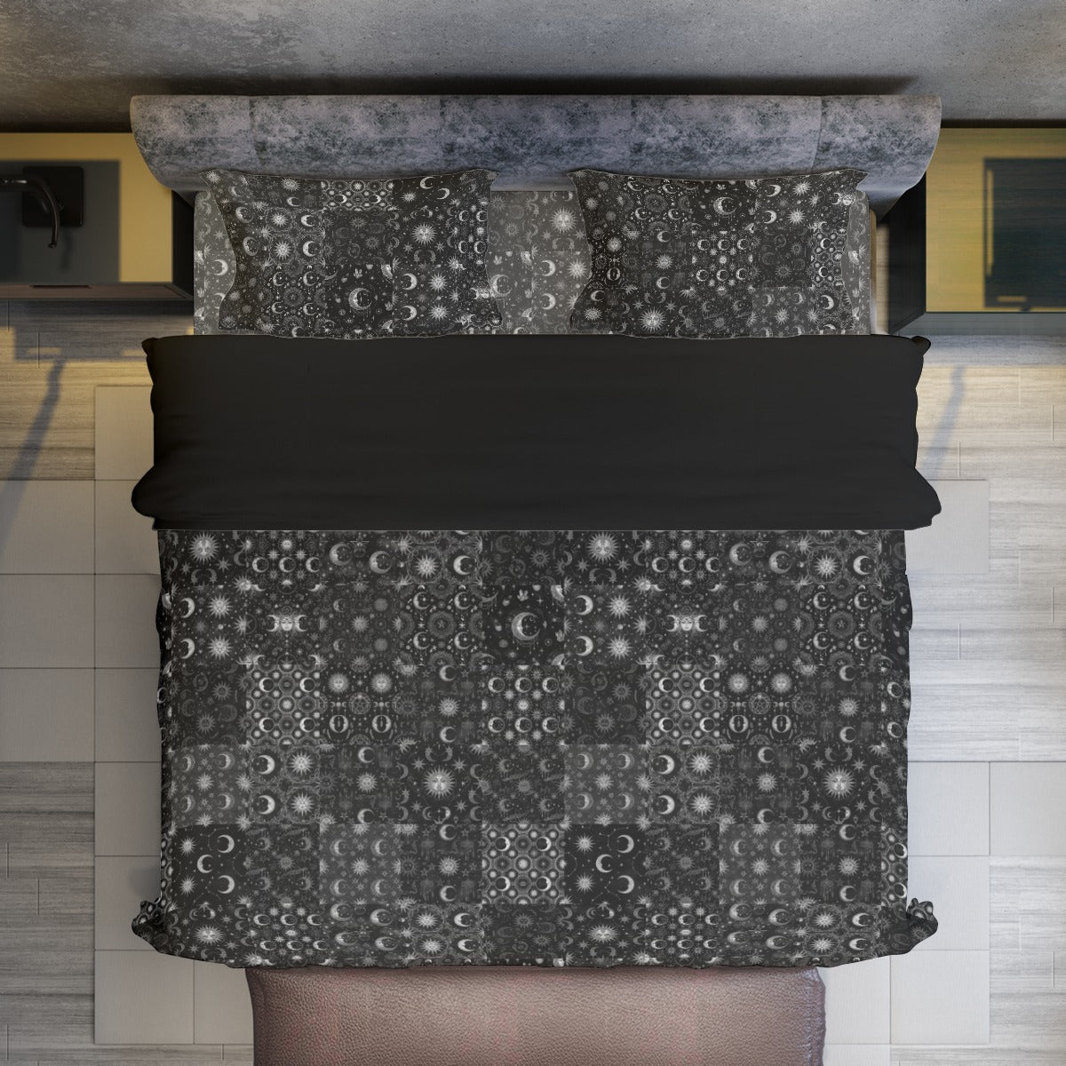 Ourย iconic patchwork celestial bedding design โ now in a moody black and gray palette, perfect for the teenage or millennial witch who prefers her magic a little darker. Featuring intricate celestial moons, stars, and suns in a patchwork pattern, this set adds a bold and mystical vibe to any bedroom.