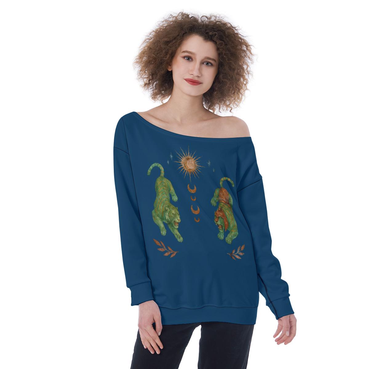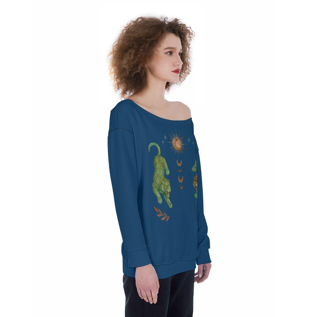 This off-shoulder women’s sweatshirt unofficially celebrates the duality of Cringer and Battle Cat from Masters of the Universe (MOTU), reimagined as celestial spirit tigers in a mystical painterly motif. The ethereal design features twin prowling cats — one calm and green, one fierce and armored — framed by crescent moons, golden sunbursts, and leafy sigils, set on a rich deep-blue backdrop.