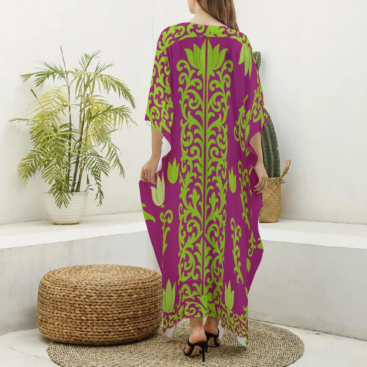 Made from imitation silk (97% polyester, 3% spandex), the fabric is soft, lightweight, and comfortable, giving you a luxurious drape without sacrificing breathability. The loose fit and V-neck design add ease and elegance, making it a versatile piece for travel, the beach, or everyday wear.