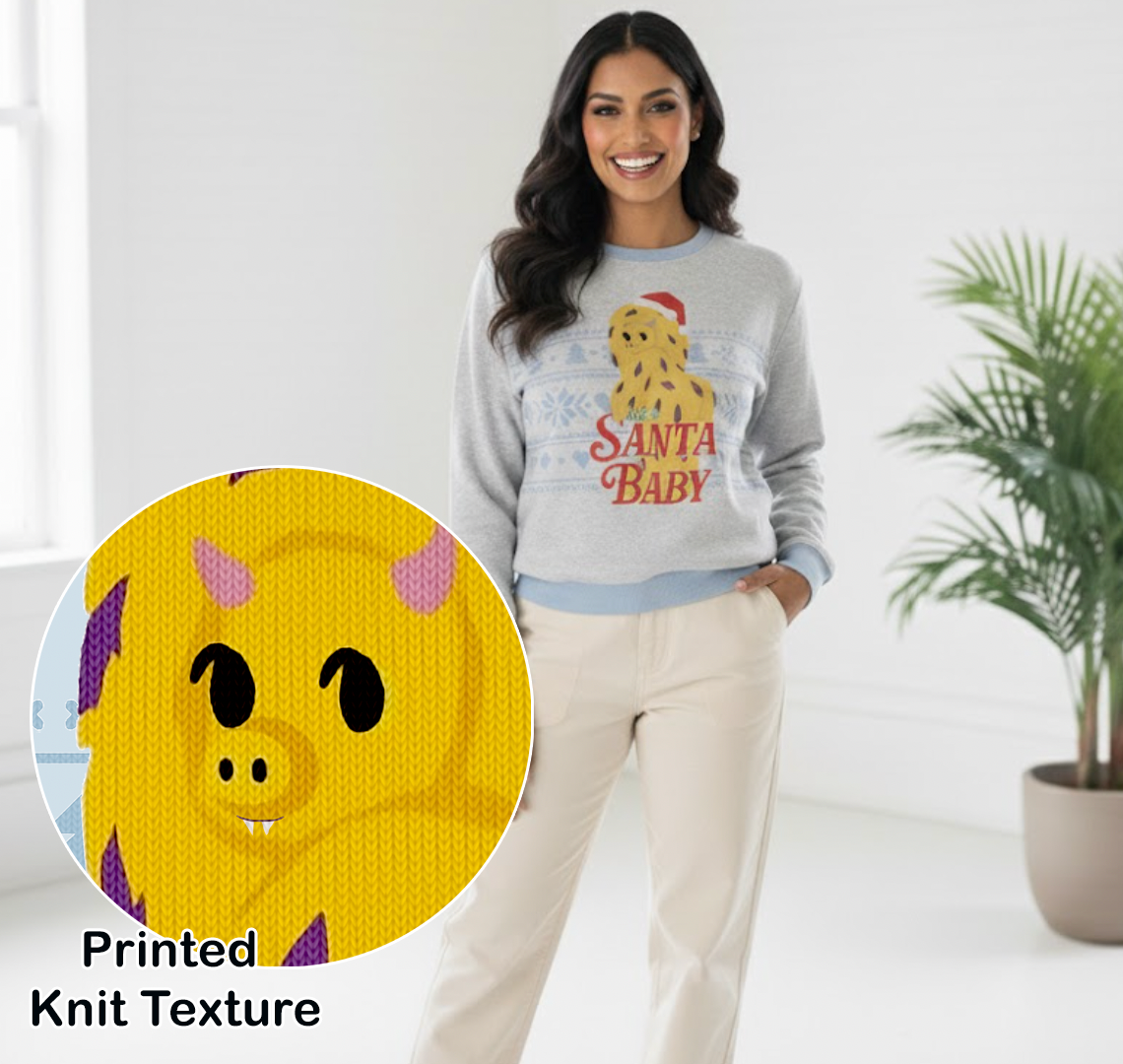 Itch-free sweater! The loose knit texture on the outside allows plenty of stretch and the soft sweatshirt-like interior keeps you cozy and comfortable all day long. Lovingly created with printed knit texture to add depth to the design.
