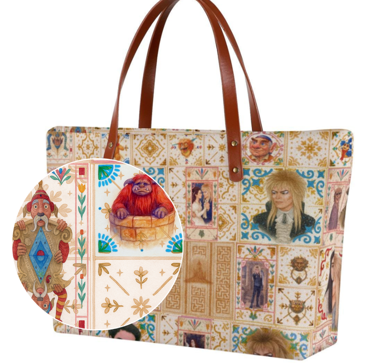 Step into a world of fantasy, romance, and cozy nostalgia with Goblin City Patchwork Tote. This perfectly imperfect design captures the cozy charm of a cottagecore crazy quilt while celebrating the beloved fantasy film of the 1980s. Each square is decorated with custom watercolor illustrations of favorite characters, magical creatures, and unforgettable Labyrinth-inspired moments. Whether you’re a fan of Labyrinth, The Dark Crystal, or just love goblincore, romantasy, and 80s fantasy nostalgia, this bag is a perfect gift—or a magical treat for yourself.