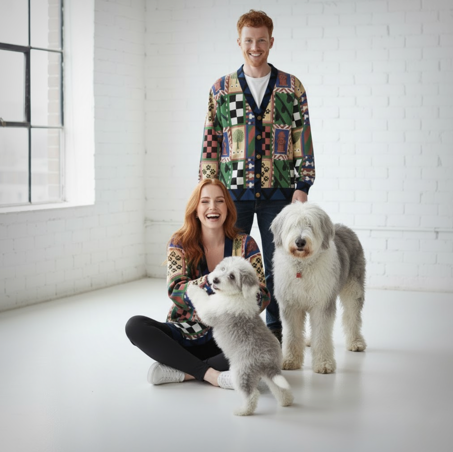 Lovingly designed to evoke the iconic patchwork patterns seen on the saddle blanket of Ambrosius in the beloved fantasy film Labyrinth, this cozy cardigan weaves together bold blocks of color, pawprints, trees, fire hydrants, checkerboard motifs, and heroic charm. It’s a wearable tribute to loyalty, courage, and the delightfully chaotic energy of charging into adventure on your trusted companion — even if said companion would very much prefer a nap.