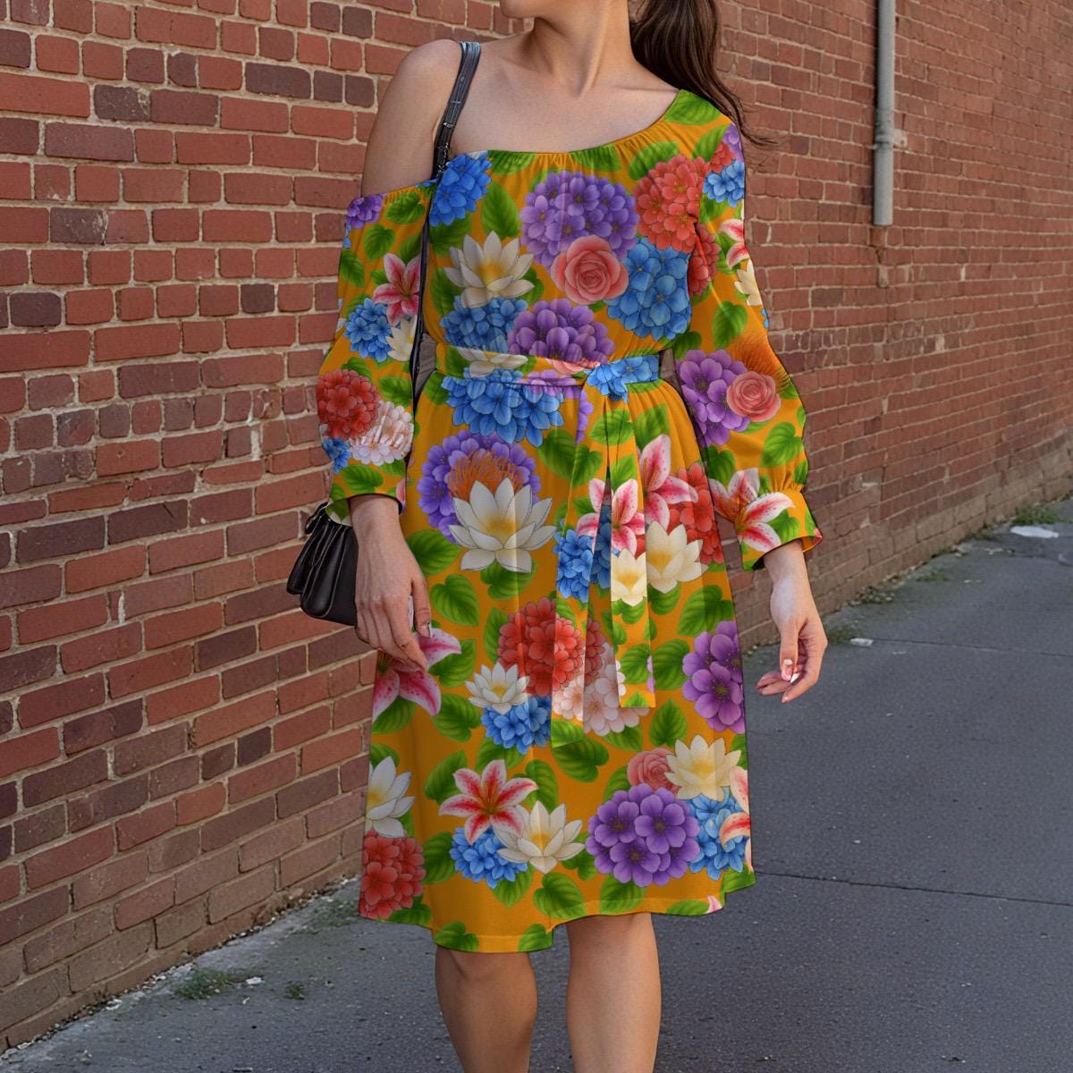This off-the-shoulder dress is designed in a flowing silhouette that exudes elegance. Made from premium double-faced brushed milk silk, it feels smooth and luxurious. It ties at the waist for a snug fit, while the elasticated neckline ensures comfort and style. Whether it's a casual outing, a beach vacation, or a chic summer evening, this dress is the perfect combination of comfort and femininity.